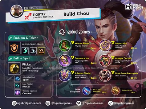 Salah satu hal penting dalam menggunakan Chou adalah memilih build yang tepat. Saya mencoba berbagai jenis build yang ada, mulai dari build fighter hingga assassin. Namun, setelah mencoba beberapa kali, saya akhirnya menemukan build yang paling cocok untuk gaya bermain saya.